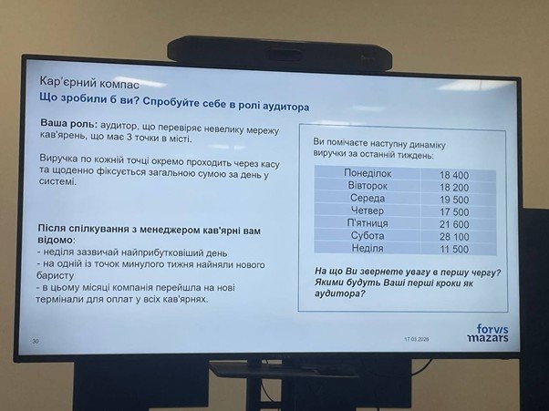 Всеволод Ярошевич, старший аудитор, пояснив сутність аудиту, його необхідність для компаній та проаналізував зі студентами реальний практичний кейс.