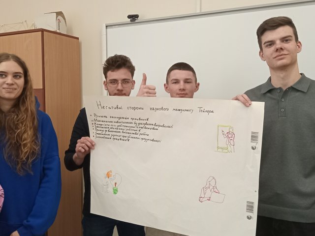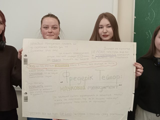 Окремим етапом заняття став перегляд і обговорення відеоматеріалу про корпорацію Ford, що дозволило співвіднести ідеї наукового менеджменту з їх практичним застосуванням у реальних управлінських моделях та простежити еволюцію управлінських підходів.