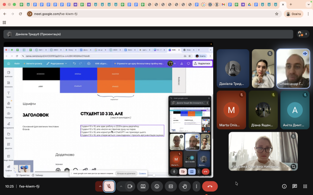 5 березня 2026 року відбулася чергова робоча зустріч учасників проєкту у форматі Zoom-консультації, під час якої студенти працювали над побудовою контентної логіки для двох комунікаційних платформ – сторінки кафедри міжнародної економіки та сторінки Факультету економіки та управління.
