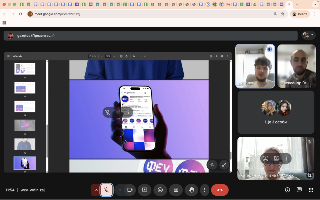 Команди презентували доценту кафедри міжнародної економіки Глазову Олександру та заступнику декана з науково-педагогічної та соціально-гуманітарної роботи Никонюк Катерині результати своєї роботи: розроблені брендбуки, у яких було представлено візуальні концепції сторінок, ключові комунікаційні акценти, кольорові рішення, стилістику оформлення та базові принципи цифрової айдентики.