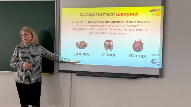 Особливу увагу було приділено використанню шахраями методів соціальної інженерії, які базуються на маніпуляції довірою, емоціями та психологічними реакціями клієнтів. У цьому контексті студентам наголошено на необхідності дотримання базових правил фінансової безпеки, зокрема недопущення передачі конфіденційної інформації (паролів, одноразових кодів, реквізитів платіжних карток) третім особам.