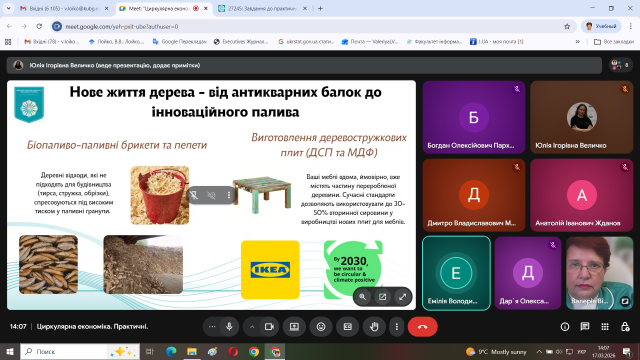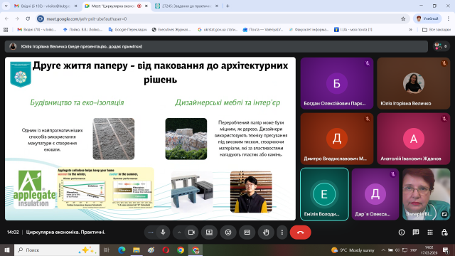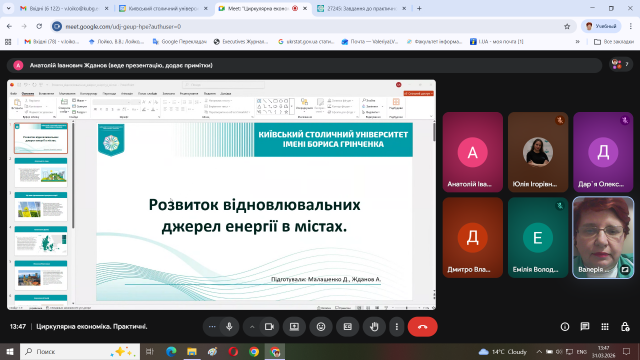Здобувачі вищої освіти поділилися власними спостереженнями прояву принципів циркулярної економіки як в містах України так і в європейських містах. Провели дискусію, які прояви принципів циркулярної економіки є дотичними до цілей сталого розвитку міст і над чим ще потрібно працювати у майбутньому.