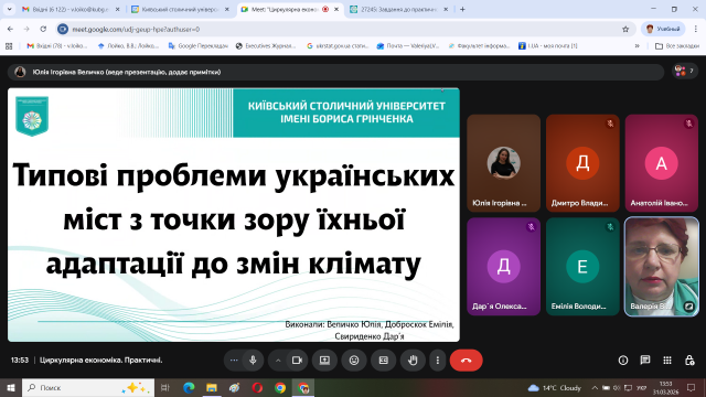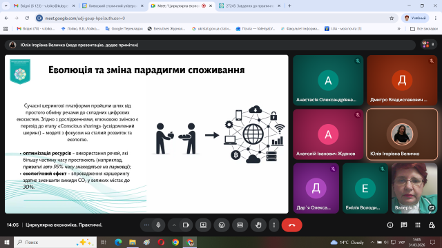 17 та 31 березня 2026 р. відбулись заняття зі здобувачами вищої освіти 3 курсу спеціальності 051 Економіка в Центрі Муніципальної економіки в рамках вивчення дисципліни «Циркулярна економіка». Обговорювали питання розвитку міст України в контексті циркулярної економіки.