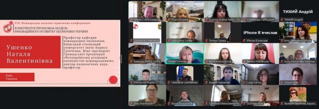 06 листопада 2025 року на запрошення давнього і надійного партнера Кафедри міжнародної економіки Факультету економіки та управління Університету Грінченка – Кафедри економіки, менеджменту та комерційної діяльності Економічного факультету Центральноукраїнського національного технічного університету (м. Кропивницький), д.е.н., професор взяла участь у VІІІ Міжнародній науково-практичній конференції «Конкурентоспроможна модель інноваційного розвитку економіки України» і виступила з вітальним словом та тезами наукової доповіді перед її учасниками.