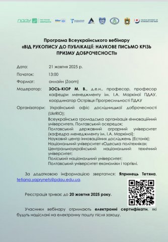 21 жовтня 2025 року відбувся Всеукраїнський вебінар для наукових і науково-педагогічних працівників, аспірантів на тему «Від рукопису до публікації: наукове письмо крізь призму доброчесності»,