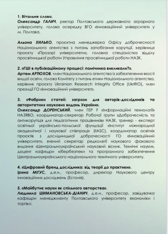 організований Українським офісом дослідницької доброчесності (UkrRIO) спільно з Всеукраїнською громадською організацією «Інноваційний університет» (Полтавський осередок), Полтавським державним аграрним університетом, Науковим центром інноваційних досліджень (Естонія), Національним університетом «Одеська політехніка», Центральноукраїнським національним технічним університетом, Поліським національним університетом та Полтавським університетом економіки і торгівлі під модерацією д.е.н., професора Зось-Кіора М.В.