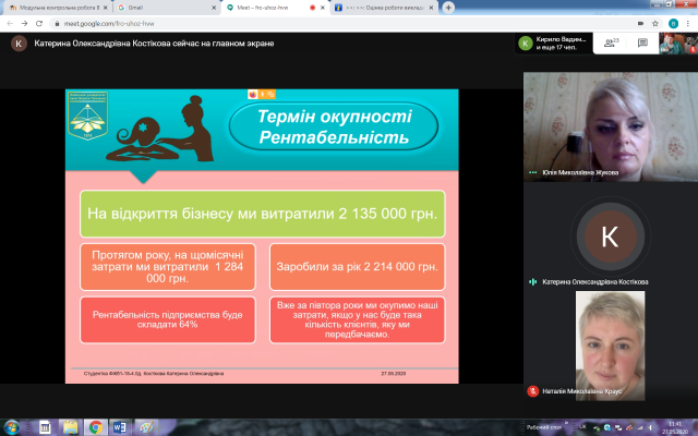 І місце, розділилось між двома проєктами, а саме: Вероніка Сергіївна Шевчук за проєкт Служба доставки “Smart Dl” (керівник Краус Н.М.) та Костікова Катерина – масажний салон “Good feelings” (керівник Жукова Ю.М.);