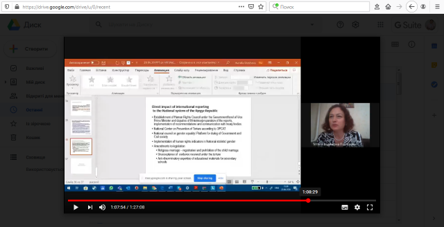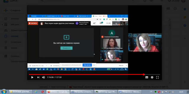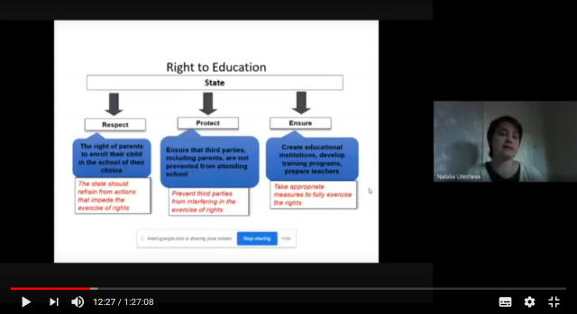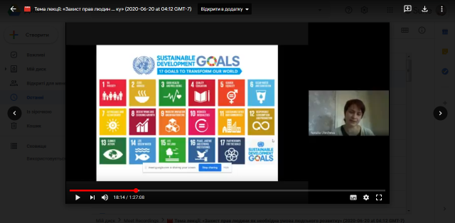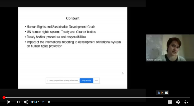 У віртуальний український простір включиласть лектор з Лондона – Утєшева Наталія – консультант з питань прав людини та недискримінації в Управлінні Верховного Комісару з прав людини ООН для Центральної Азії, докторант Університету Кінгстон (Лондон, Великобританія). В ході лекції було розглянуто взаємозалежність між правами людини та цілями сталого розвитку; система захисту прав людини ООН та вплив цієї організації на національний розвиток захисту прав людини. Слухачі познайомились із системою важелів і противаг в питаннях дотримання прав людини та методами оцінки її ефективності. |