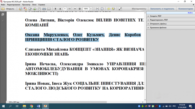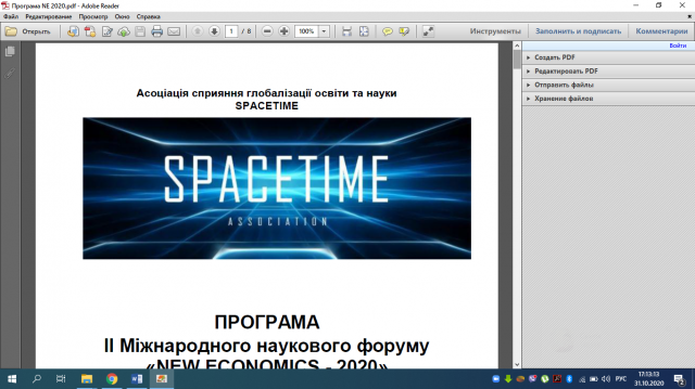 31.10.2020 Асоціація сприяння глобалізації освіти та науки SPACETIME при підтримці Академії економічних наук України, Інституту соціально-економічних ініціатив (Україна), Науково-освітнього центру «Science Study Service» за участю професорсько-викладацького складу кафедри управління Факультету інформаційних технологій та управління Київського університету імені Бориса Грінченка провели ІІ Міжнародний науковий форум "New economics-2020". Топ-тема обговорення: "Від стагнації до процвітання: в пошуках ефективних рішень подолання економічних наслідків COVID-19".