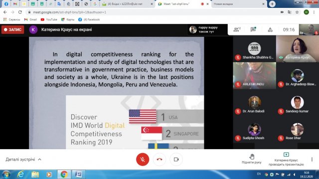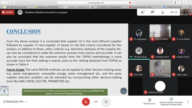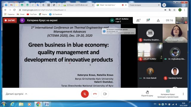 Доцент кафедри управління, факультету інформаційних технологій та управління Київського університету імені Бориса Грінченка к.е.н., доцент Краус Катерина Миколаївна взяла участь, з власним он-лайн виступом, на Міжнародній конференції «Thermal Engineering and Management Advances», яка проходила 19-20 грудня 2020 року на базі Джалпайгурського державного навчального закладу. Краус К.М. та Краус Н.М. представили свої власні наукові напрацювання в результаті реалізації проєкту «Teaching Digital Entrepreneurship» (Еразмус+ КА203 «Стратегічне партнерство»).