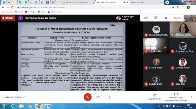 В ході дискусії з організаторами конференції, професор кафедри фінансів та економіки Наталія Миколаївна зазначила, що ядро VII-го технологічного укладу, що закладає підвалини становлення зеленого бізнесу в синій економіці представлене напрямом когнітивних та соціогуманітарних технологій; головним виробничим чинником буде виключно креативний інтелект. Проблеми, що вирішуються – “Всесвітнє оволодіння вакуумом”; нові форми життєдіяльності на планеті; конструювання нової соціальної реальності. Можливі варіанти реалізації, на думку Наталії Миколаївни, – це технології “термоядерного синтезу”, псі-технології (досягнення в сучасній психології, що включають нові засоби управління людьми), біоенергетика, технології, що пов’язанні з мораллю і відповідальністю. Реалізуватиметься даний уклад, на думку Наталії Миколаївни, за допомогою гіперінтелекту, гіперзнання, гіперінформації, гіперкомунікації. В найближчому майбутньому ми матимемо так звані “ігри з підсвідомістю та розумом”. Прогнозується наявність 5-ти когнітивних технологій: нейровізуалізація, когнотропні препарати, когнітивні асистенти, Мозко-Машинні інтерфейси, штучні органи почуттів.
