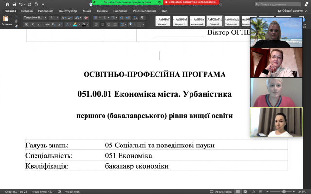 11 січня 2021 року відбулась онлайн зустріч робочої групи з обговорення проєкту нової редакції освітньо-професійної програми 051.00.01 «Економіка міста. Урбаністика» для першого (бакалаврського) рівня вищої освіти відповідно до Стандарту вищої освіти зі спеціальності 051 Економіка. На зустрічі були присутні завідувач кафедри фінансів та економіки Ольга Сосновська, гарант програми Юлія Жукова, професор кафедри Наталя Краус та доцент кафедри Оксана Казак.
