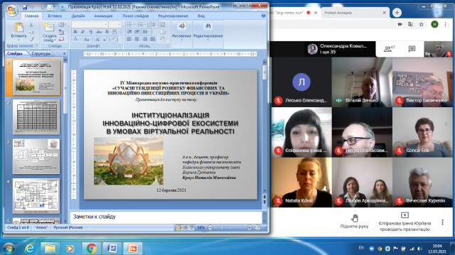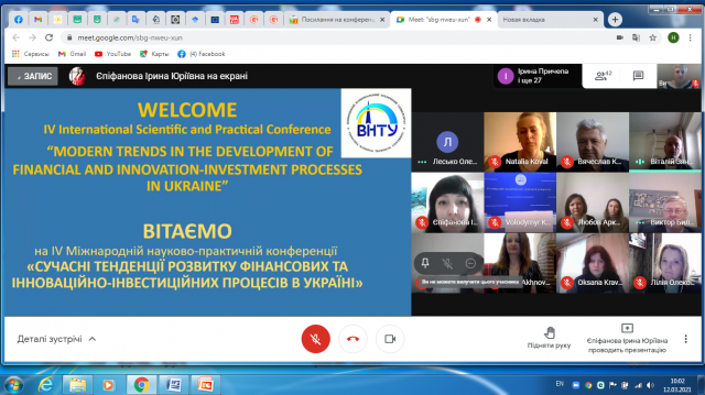 Професор кафедри фінансів та економіки, факультету інформаційних технологій та управління Київського університету імені Бориса Грінченка д.е.н., доцент Краус Наталія Миколаївна взяла участь, з власним он-лайн виступом, у ІV Міжнародній науково-практичній конференції «Сучасні тенденції розвитку фінансових та інноваційно-інвестиційних процесів в Україні», яка відбулася 12 березня 2021 року на базі Вінницького національного технічного університету. До обговорення фінансового механізму соціально-економічного розвитку України долучилась і доцент кафедри управління к.е.н. Краус Катерина Миколаївна та представила свої тези доповіді на тему “Закони інноваційно-цифрового розвитку економіки України : глобалізаційний аспект”.