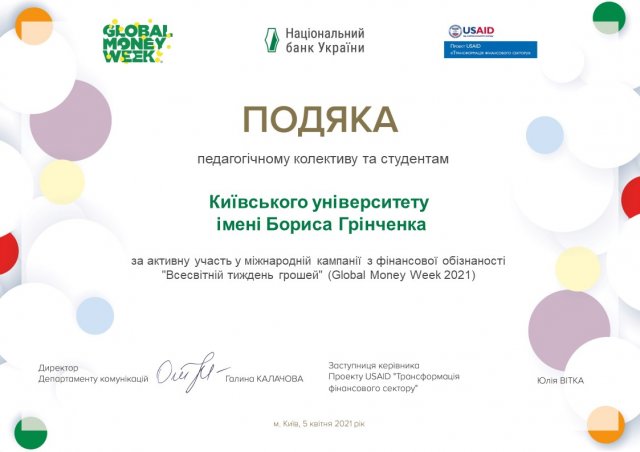 В рамках діяльності центру функціонального менеджменту кафедри управління Факультету інформаційних технологій та управління студенти IІ-го курсу спеціальності 073 Менеджмент Рикало Валерія та Заплавний Денис впродовж тижня онлайн-заходів Національного банку Global Money Week долучилися до низки вебінарів НБУ – 30 років розвитку: якими ми були, що змінилось і яке майбутнє будуємо” (22 березня 2021 р.), “Еволюція монетарної політики НБУ за роки незалежності” (23 березня 2021 р.), “Лайфхаки з платіжної безпеки” (24 березня 2021 р.). В рамках цих заходів студенти дізналися про: особливості діяльності НБУ та його ключові функції, трансформаційні зміни за роки незалежності та познайомляться з основними стратегічними напрямами подальшого розвитку НБУ у розвитку монетарної політики в Україні, передумови переходу НБУ до режиму інфляційного таргетування та особливості збереження цінової стабільності в часи глобальної невизначеності як не потрапити на гачок шахраїв, навчяться безпечно купувати онлайн, розпізнавати види та сценарії платіжного шахрайства.