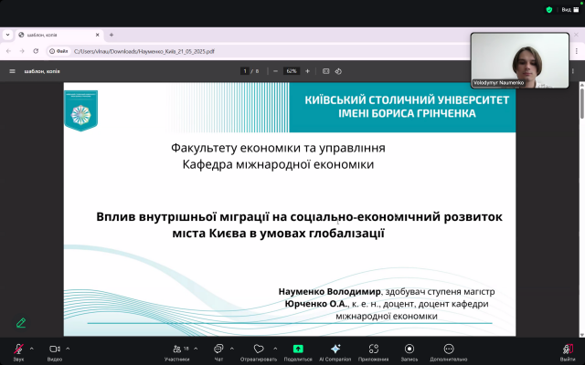 - Науменко В.М., здобувач вищої освіти ОПП «Міжнародна економіка»: «Вплив внутрішньої міграції на соціально-економічний розвиток міста Києва в умовах глобалізації»