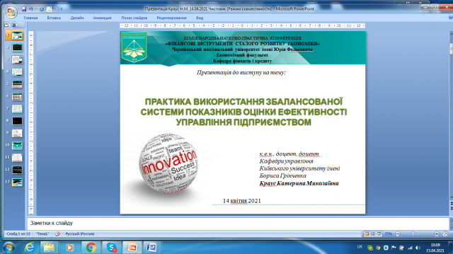 Краус Катерина Миколаївна, доцент кафедри управління, Факультету інформаційних технологій та управління Київського університету імені Бориса Грінченка взяла участь з виступом, в Міжнародній науково-практичній конференції “Фінансові інструменти сталого розвитку економіки”, яка відбулася 14 квітня 2021 року в Чернівецькому національному університеті імені Юрія Федьковича та представила свої тези доповіді на тему “Практика використання збалансованої системи показників оцінки ефективності управління підприємством”.