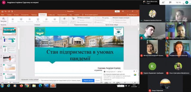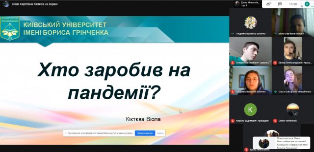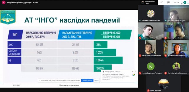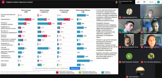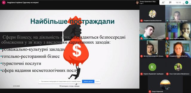 Зустріч була присвячена актуальній темі – «Економічний та фінансовий розвиток суб’єктів господарювання в умовах пандемії»., тож студенти обговорили такі питання як стан роботи підприємств в умовах пандемії, наслідки пандемії для страхових компаній, сфери бізнесу, які найбільше постраждали від обмежень, які вводяться під час карантинних заходів.