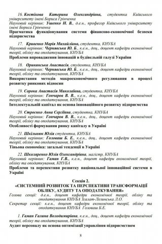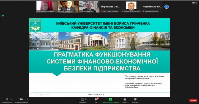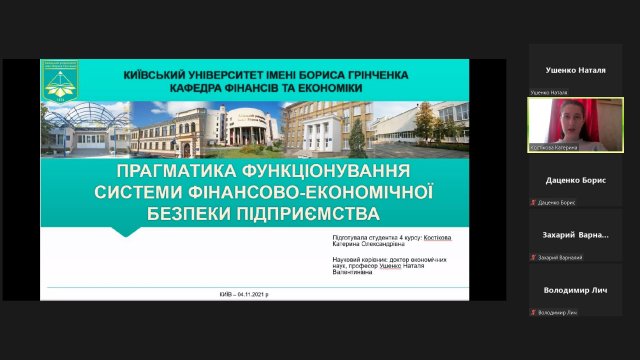 4-5 листопада 2021 року у Київському національному університеті будівництва і архітектури відбулася ІІ Міжнародна науково-практична конференція «Проблеми генезису економіки інтелектуально-інноваційного капіталу». У конференції взяла участь студентка 4 курсу, групи ФіКб-1-18-4.0д Київського університету імені Бориса Грінченка Костікова Катерина Олександрівна з доповіддю на тему "Прагматика функціонування фінансово-економічної безпеки підприємства". У дослідженні розкривається системне поняття «фінансово-економічна безпека підприємства» з акцентом на визначення загроз внутрішнього та зовнішнього середовищ. Поєднання у навчальному процесі освітньої та наукової складової є важливим для подальшої професійної діяльності у сфері фінансів. Наукове керівництво підготовкою до конференції здійснювала д.е.н., професор Ушенко Наталя Валентинівна.