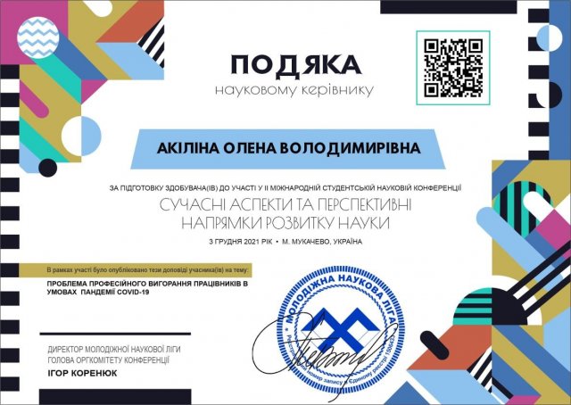 Результати минулорічного дослідження Центру основ управління, пов’язаного з тематикою «work-life balance», нині знайшли своє продовження в дослідженні проблеми професійного вигорання працівників в умовах карантинних обмежень COVID-19 через небажання роботодавців вносити необхідні зміни в організацію праці та корпоративну культуру. Студентка 2 курсу спеціальності 073 «Менеджмент», Анастасія Приймачек, здійснила апробацію результатів нового дослідження, прийнявши участь у II Міжнародній студентській науковій конференція «СУЧАСНІ АСПЕКТИ ТА ПЕРСПЕКТИВНІ НАПРЯМКИ РОЗВИТКУ НАУКИ» (03.12.2021, Мукачево)