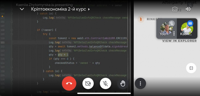 Ксенія поділась своїми знаннями та досвідом зі студентами та запрошеними гостями, розказала про особливості смартконтрактів та розробки децентралізованих додатків (Dapps), можливості та сфери її використання. Навела приклади програм та проектів, реалізованих на блокчейн-платформах та проектів, що використовують технологію розумних контрактів, провівши практичний кейс, який це наочно показує.