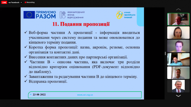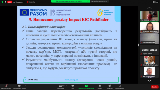 23 серпня 2022 року Краус Катерина Миколаївна, к.е.н., доцентка, доцентка кафедри управління факультету Інформаційних технологій та управління Київського університету імені Бориса Грінченка взяла участь у вебінарі на тему “Гранти Європейської інноваційної ради на дослідження та інновації: інструменти Pathfinder &Transition”, що проводився в рамках проєкту “Підвищення поінформованості українських організацій про можливості участі у дослідницьких та інноваційних програмах ЄС” та фінансуєтсья Європейським Союзом і Міжнародним Фондом “Відродження” в межах грантового компоненту проєкту EU4USociety.