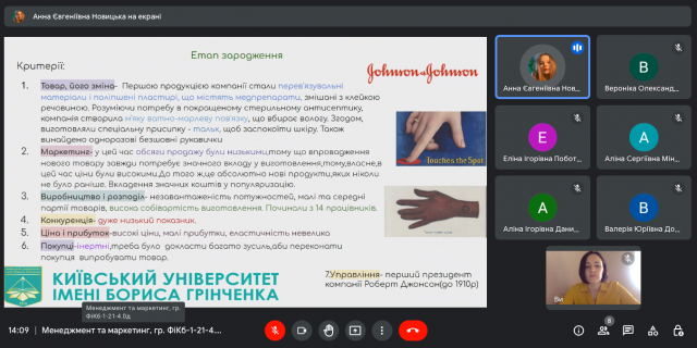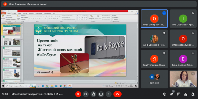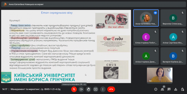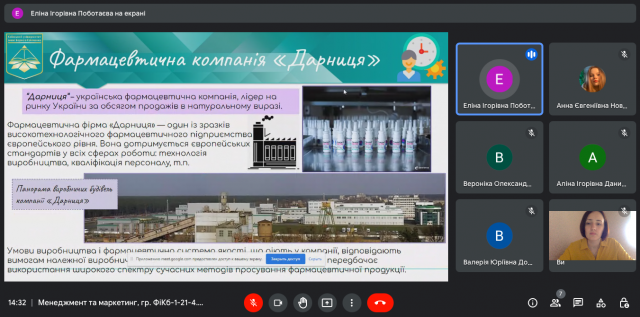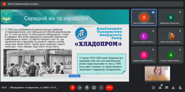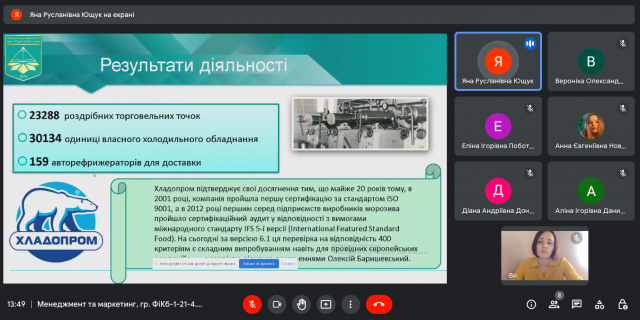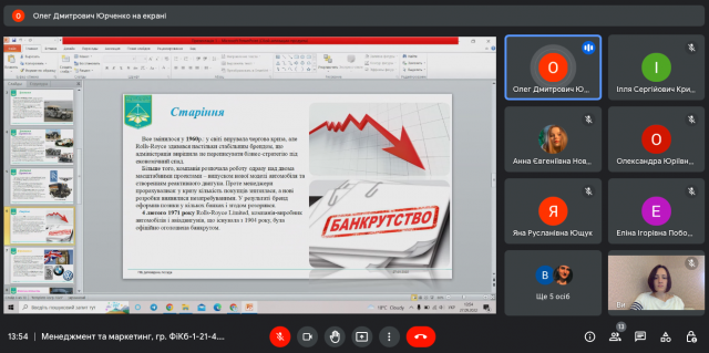 26-27 вересня 2022 року в ході вивчення навчальної дисципліни “Менеджмент та маркетинг” (викладач – к.е.н., доцент Катерина Миколаївна Краус) студенти IІ-го курсу спеціальності 072.00.01 Фінанси і кредит (гр. ФіКб-1-21-4.0д) представили результати індивідуальних досліджень та виступили з доповідями щодо особливостей діяльності українських та іноземних організацій на різних етапах їх життєвого циклу, зміну виробничих потужностей та маркетингової стратегії, ринків збуту і підходів до прийняття управлінських рішень.