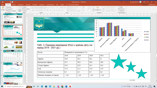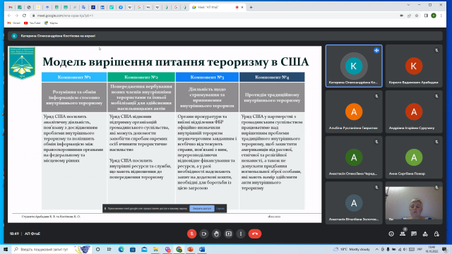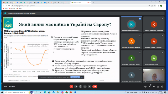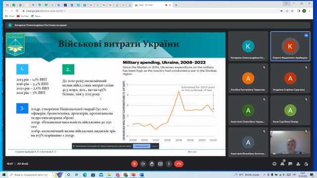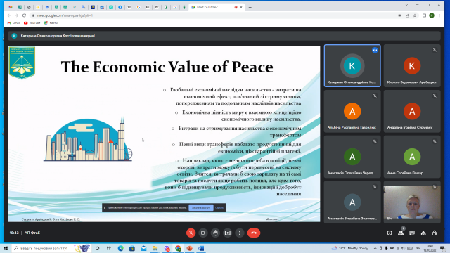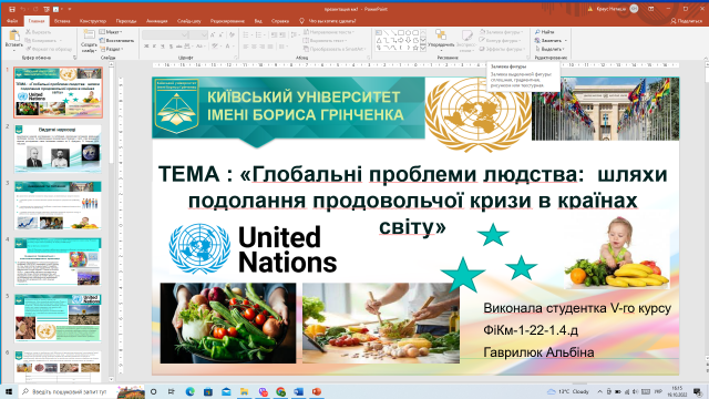 В рамках роботи Центру провайдингу інновацій та цифрового підприємництва було проведено навчально-наукову зустріч зі студентами магістрами спеціальності 072 “Фінанси, банківська справа та страхування”. Модерувала зустріч професор кафедри фінансів Краус Наталія Миколаївна. Студенти представили до обговорення свої презентаційні матеріали на актуальні питання сфери фінансів та економіки. Зокрема, Арабаджи Кирило та Катерина Костікова сфокусували свою наукову увагу на проблемі подолання тероризму в світі та потребі відпрацювання механізму посиленого контролю за його фінансуванням. Гаврилюк Альбіна виступила з доповіддю на тему «Глобальні проблеми людства: шляхи подолання продовольчої кризи в країнах світу». Студентка зазначила, що від вирішення продовольчої проблеми та подолання голоду, у світі (станом на 2022 р.), залежить життя понад 820 мільйонів осіб. В цілому, періодичні проблеми щодо доступу до продуктів харчування відчувають біля 26,4% населення світу (що становить біля 2 мільярдів осіб). ООН у Цілях сталого розвитку ставить стратегічне завдання – досягти рівня «нульового голоду» до 2030 року у всіх країнах світу.