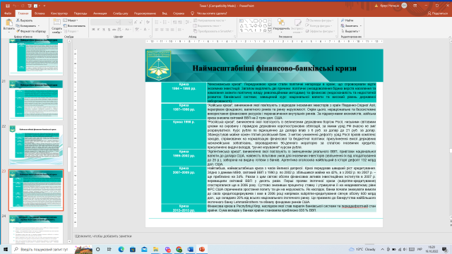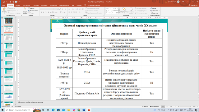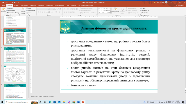 Професор кафедри фінансів Краус Наталія Миколаївна в ході обговорення представила для роздумів студентів характерні особливості та специфічні риси фінансової кризи в Україні. Наталія Миколаївна зауважила, що вплив кризи на економіку України є значним. Найважливішими наслідками є: погіршення макроекономічних показників; зниження темпів зростання ВВП; дефіцитний платіжний баланс, велика залежність від імпорту капіталу, високих технологій, нафти і газу; великий розмір зовнішнього боргу країни, що веде його до ризику невиплати; скорочення депозитної маси; зниження ліквідності, погіршення портфеля й активів банківської системи; зниження обсягів кредитування економіки; девальвація гривні; скорочення надходжень і видатків бюджету; ослаблення довіри до фінансових установ; серйозні труднощі українських банків пов'язані з поверненням зовнішніх запозичень, залучення нових інвестицій; нестабільність на валютному ринку його спекулятивний характер; зменшення резервів НБУ, який змушений продавати валюту для задоволення ажіотажного попиту; погіршення добробуту домашніх господарств, скорочення реальних доходів, затримка виплати заробітної плати, особливо у промислових регіонах; зниження загального рівня життя населення, погіршення забезпеченості громадян товарами першої необхідності (продукти харчування, одяг) та послугами соціально-побутової сфери (транспорт, медицина, освіта, культура).