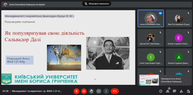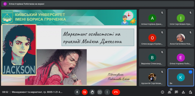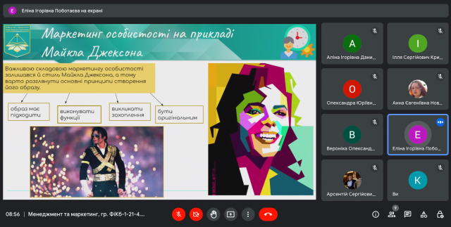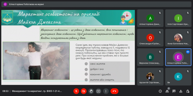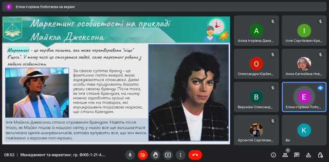 8 листопада 2022 року в ході вивчення дисципліни “Менеджмент та маркетинг” (викладач – к.е.н., доцент Катерина Миколаївна Краус) студенти IІ-го курсу спеціальності 072.00.01 Фінанси і кредит (гр. ФіКб-1-21-4.0д) представили результати своїх досліджень та виступили з доповідями щодо особливостей маркетингу особистості (співаки, спортсмени, митці, бізнесмени, менеджери тощо). Як просувати особистість? Як її популяризувати? Які маркетингові інструменти використати, щоб сформувати та підтримувати її імідж? На ці та інші запитання ми знайшли відповідь спільно в ході обговорення та дискусії.