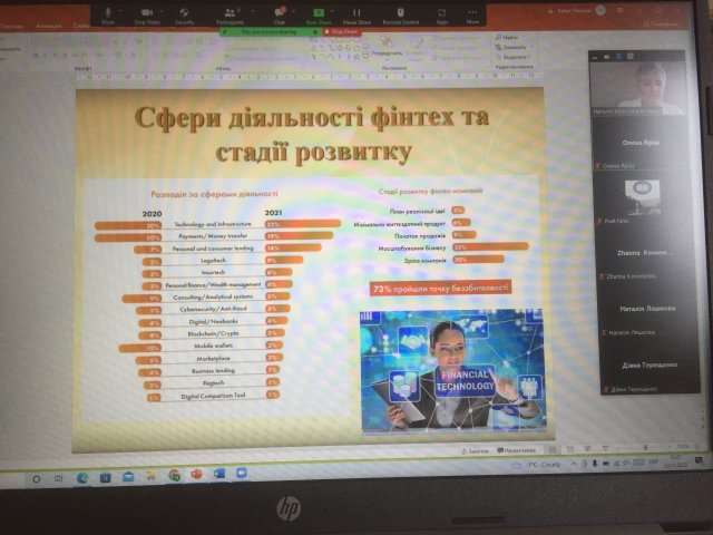 В своєму виступі Наталія Миколаївна зазначила, що станом на 2021 рік засновники здебільшого фінансують створення фінтех-компаній з власних коштів (65%). Гроші приватних інвесторів залучали 18% фінтех-компаній, при цьому ангельські інвестиції як джерело капіталу було присутнє лише 2% фінтехів. Головним клієнтом фінтехів залишався великий бізнес, а саме: 37%. Лектор зауважила, що серед українських фінтехів найбільш розповсюдженими у використанні були такі технології як API. Саме на інтеграційній системі побудована більшість пропозицій, які представлені на ринку. Це є логічним, оскільки 22% фінтехів працюють у сфері Technology and Infrastructure.