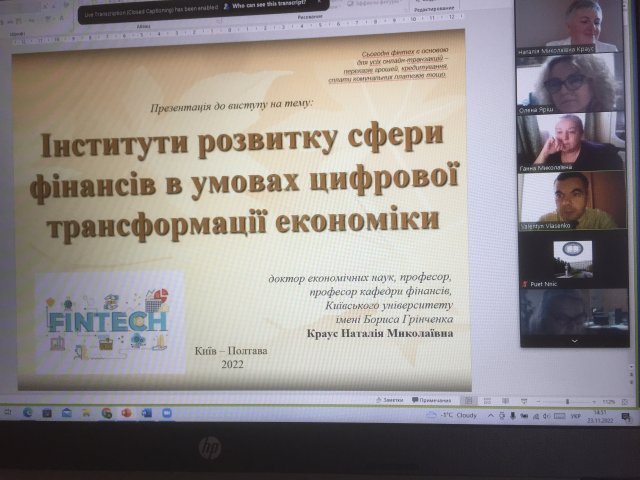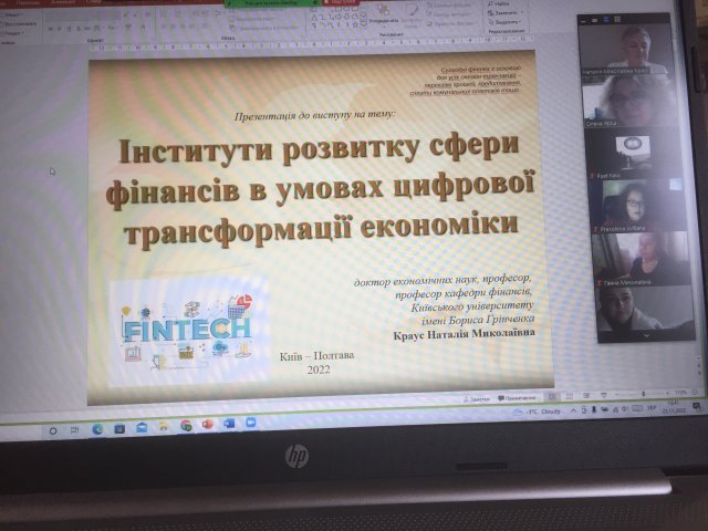 В рамках програми стажування Наталія Миколаївна 23 листопада 2022 року провела онлайн лекцію для студентів спеціальності 072 “Фінанси, банківська справа та страхування” на тему “Інститути розвитку сфери фінансів в умовах цифрової трансформації економіки”, з авторського науково-просвітницького курсу “Енергія економіки”. На зустрічі були присутні понад 30 запрошених учасників заходу. З вітальним словом до наукової спільноти ПУЕТ звернулася Яріш Олена Валентинівна, завідувач кафедри фінансів та банківської справи, к,е.н, доцент, яка й представила Наталію Миколаївну як спікера науково-просвітницької зустрічі.