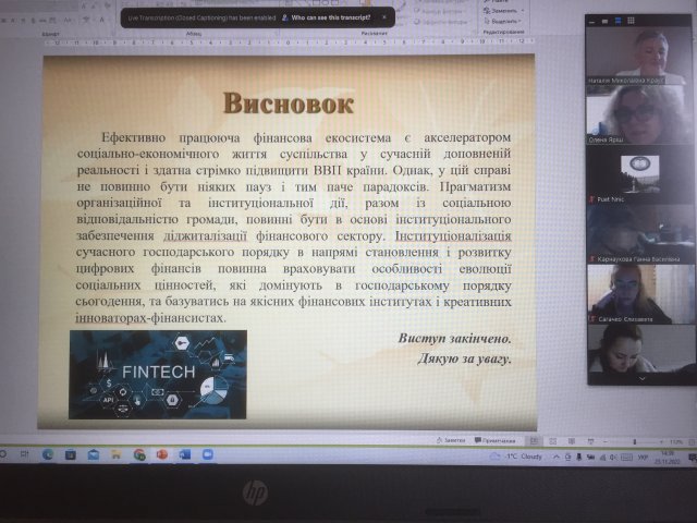Наталія Миколаївна в ході лекції наголосили, що становлення та розвиток фінансової екосистем – це складний багатоплановий і затяжний в часі процес, та для України сьогодні проблема впровадження цифрових критичних технологій через екосистеми нових фінансових інститутів носить принциповий характер. Наталія Миколаївна звернула увагу на те, що залежно від співвідношення формальних і неформальних фінансових норм у суспільстві існують численні форми взаємодоповнення та взаємодії фінансових інститутів у динаміці, а саме: формальні фінансові інститути вводяться на основі наявних у суспільстві неформальних звичаїв, звичок, традицій, цінностей, тобто неформальні правила сфери фінансів формалізуються; формальні правила сфери фінансів вступають у пряму суперечність з неформальними традиціями; формальні фінансові правила створюються для протидії наявним неформальним звичаям сфери фінансів і повинні сприяти формуванню оновлених неформальних фінансових інститутів; формальні і неформальні фінансові інститути існують паралельно, тобто неформальні традиції сфери фінансів заповнюють “інституціональні ями”, які не регулюються наявними формальними фінансовими інститутами; формальні фінансові правила “пристосовуються” до неформальних, змінюючись під впливом суспільства чи вимог часу.