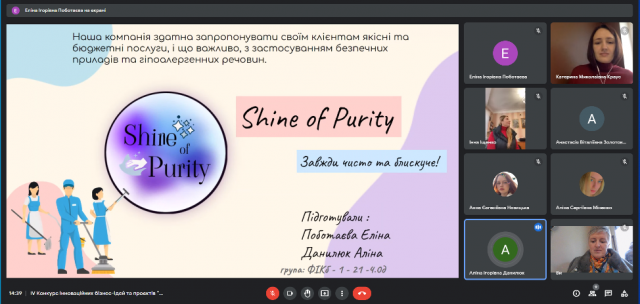 1) “Shine of Purity” (студентки спеціальності Фінанси, банківська справа та страхування Київського університету імені Бориса Грінченка Еліна Поботаєва та Аліна Данилюк, керівник к.е.н., доцент Краус К.М.) – І місце