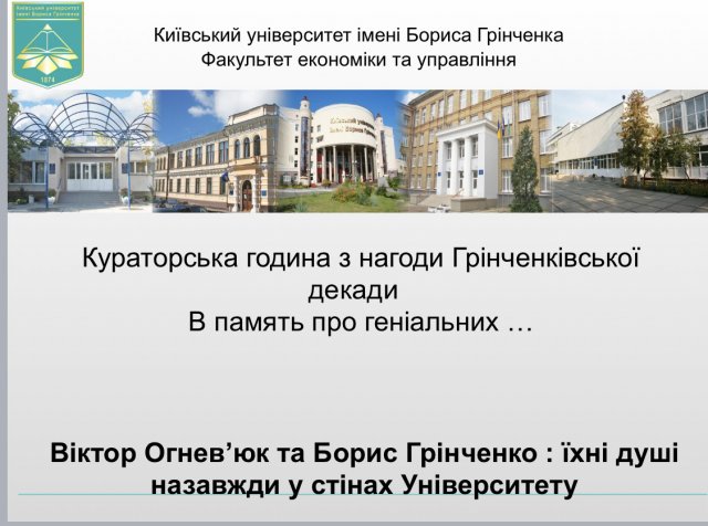 Цими днями на Факультеті економіки та управління пройшли кураторські години, на яких обговорилися значення та внесок Бориса Дмитровича Грінченка та Віктора Олександровича Огнев‘юка в ідеологію, сутність нашого Університету .