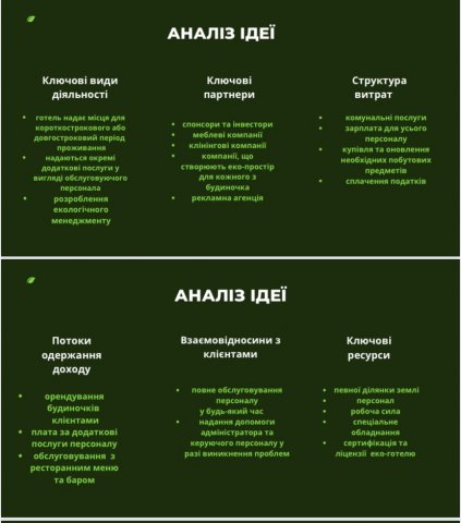 Фахове ядро проектної роботи становило розробка бізнес-моделі CANVAS, яка зосереджується на створенні цінності продукту чи послуги через розробку споживчого сегменту, каналів збуту, взаємозв’язків з клієнтами, ключових ресурсів, структури витрат та потоків надходження доходів, ключових партнерів. Окремі команди пішли далі – аналізувати сильні та слабкі сторони бізнес-проекту, виокремлювали передумови його успішного впровадження.