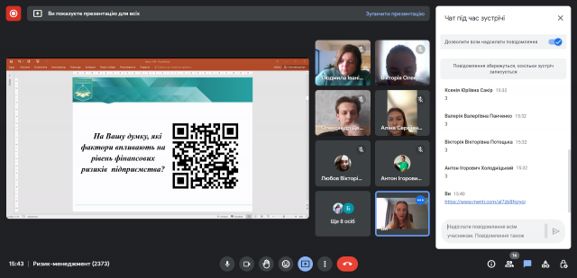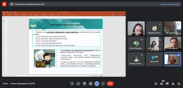 10 квітня 2023 року кандидат економічних наук, доцент кафедри фінансів Нечипоренко Аліна Володимирівна провела відкриту лекцію з навчальної дисципліни «Ризик-менеджмент» на тему «Види фінансових ризиків та методи їх оптимізації» для здобувачів вищої освіти 3 курсу спеціальності 072 «Фінанси, банківська справа та страхування».