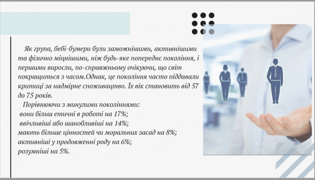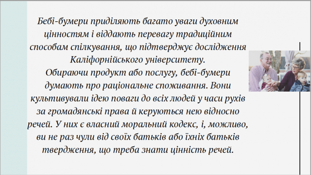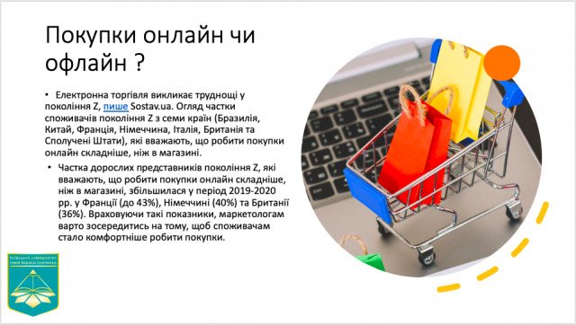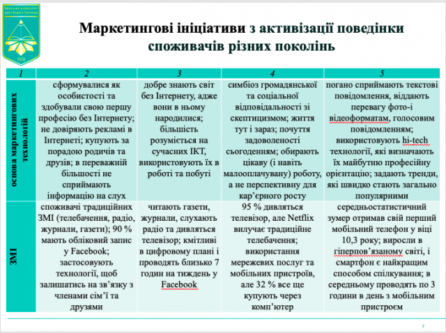 На занятті було представлено результати пошукової роботи студентів щодо маркетингових ініціатив з активізації поведінки споживачів в розрізі різних поколінь (бейбі-бумерів, Х, міленіалів, зумерів). З презентаціями виступили Тетяна Кучер, Юлія Годун, Аліса Сенаторська та Крістіна Глебець. Також, в межах теми заняття проведено аналітичні розрахунки щодо визначення маркетингового потенціалу субʼєкта господарювання на ринку, а також здійснено розрахунок ймовірних витрат на маркетингові заходи. Було підтверджено тезу про те, що маркетингові дослідження є важливою частиною маркетингової діяльності, адже охоплюють заходи, які потрібно здійснювати планомірно і постійно, для співставлення очікуваних результатів з реальною ситуацією на ринку для реагування на неї і своєчасного внесення коректив у господарську діяльність.