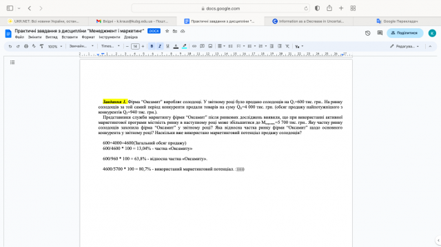 11 квітня 2023 року на 2-й парі в офлайн режимі (ауд. 521) відбулося відкрите заняття на тему “Маркетингове дослідження ринку” в рамках дисципліни “Менеджмент і маркетинг” і групі студентів 1-го курсу спеціальності 051 Економіка (гр. ЕКб-1-22-4.0д).
