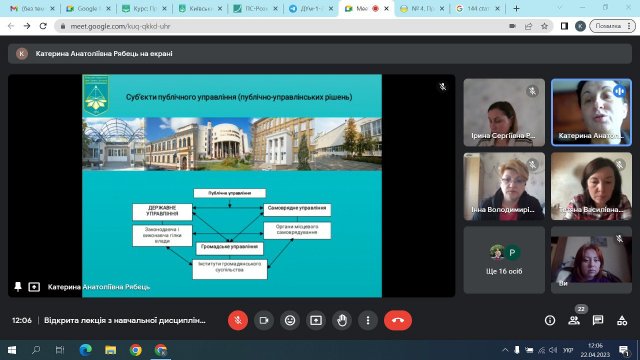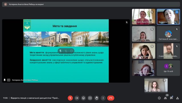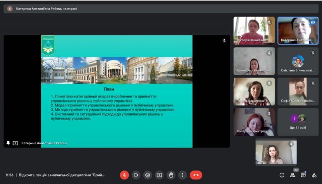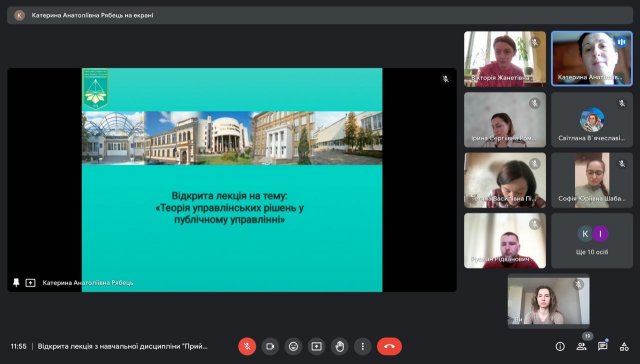 22 квітня 2023 року відбулася відкрита лекція доктора наук з державного управління, доцента, професора кафедри управління Рябець Катерини Анатоліївни на тему: «Теорія управлінських рішень у публічному управлінні» для студентів 1 курсу (другого (магістерського) рівня) спеціальності 281 Публічне управління та адміністрування.