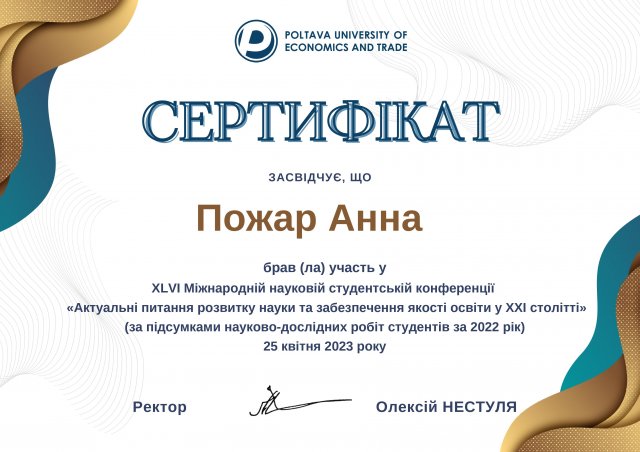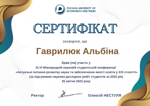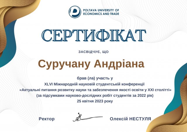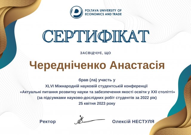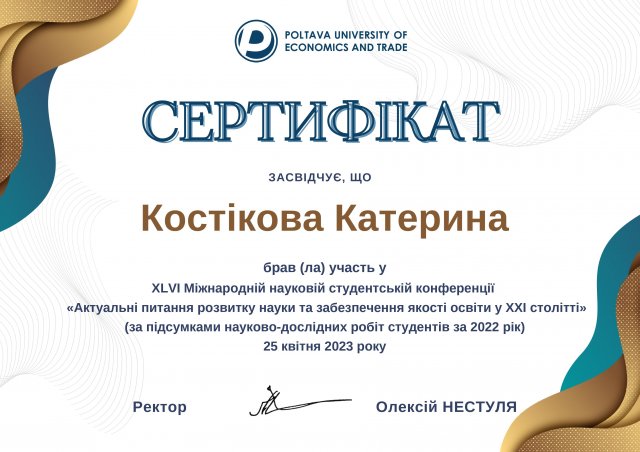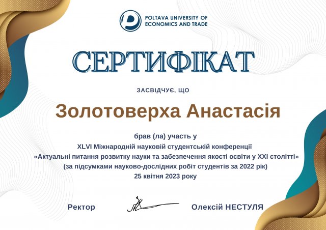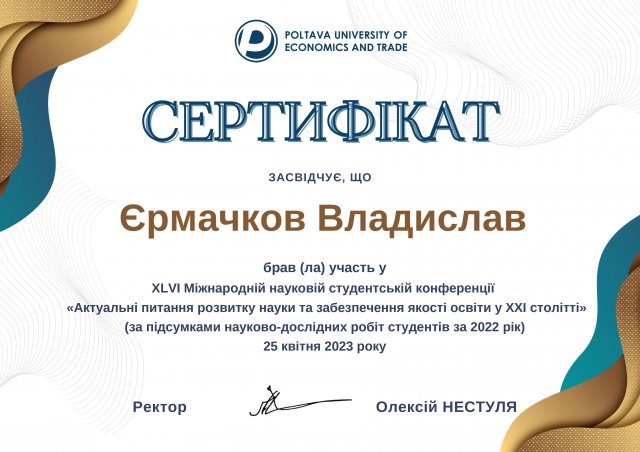 В рамках роботи Центру цифрових фінансів та е-бізнесу (кафедра фінансів ФЕУ) 25 квітня 2023 року студенти 5 курсу спеціальності 072 “Фінанси, банківська справа та страхування” (другого освітнього рівня “магістр”), гідно представили свої наукові здобутки на ХLVІ Міжнародній науковій студентській конференції «Актуальні питання розвитку науки та забезпечення якості освіти у ХХІ столітті». Конференція проводилася на базі ВНЗ Укоопспілки “Полтавський університет економіки та торгівлі”, за ініціативи викладачів кафедри Фінансів.