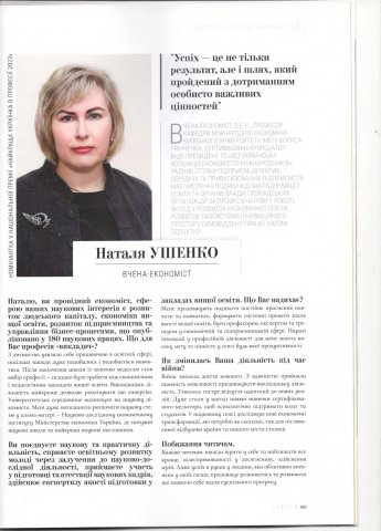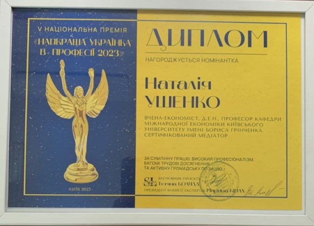 Серед лауреатів V Національної премії відзначена вчена-економіст, професор кафедри міжнародної економіки Наталя УШЕНКО за сумлінну працю, високий професіоналізм, вагомі трудові досягнення та активну громадську позицію.