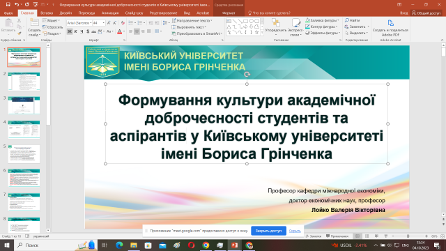 4 жовтня 2023 р. відбувся семінар з аспірантами 1 курсу на тему: «Формування культури академічної доброчесності у аспірантів у Київському університеті імені Бориса Грінченка». Гарант ОНП «Економіка» доктор економічних наук, професор Лойко Валерія Вікторівна обговорила з аспірантами положення нормативно-правових актів України, у яких регламентовані положення щодо академічної доброчесності, зокрема статтю 42 «Академічна доброчесність» Закону України «Про освіту». Ознайомились з текстом нормативних документів нашого університету, зокрема «Положенням про академічну доброчесність науково-педагогічних, наукових, педагогічних працівників та здобувачів вищої освіти Київського університету імені Бориса Грінченка» та «Положенням про підготовку здобувачів вищої освіти ступеня доктора філософії та доктора наук в Університеті Грінченка». Аспіранти дискутували з приводу можливих випадків прояву академічної недоброчесності у наукових роботах, видів плагіату та норм академічної відповідальності, до якої можуть бути притягнені здобувачі вищої освіти за порушення академічної доброчесності. Розглянули можливості систем перевірки на плагіат текстів робіт, які використовуються у Київському університеті імені Бориса Грінченка, зокрема антиплагіатних систем Unicheck та Strike Plagiarism.