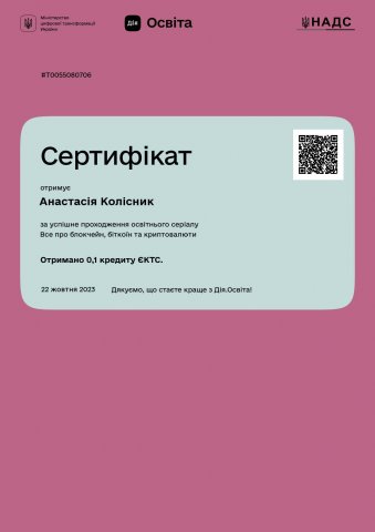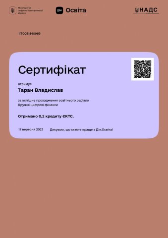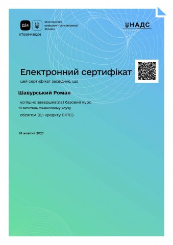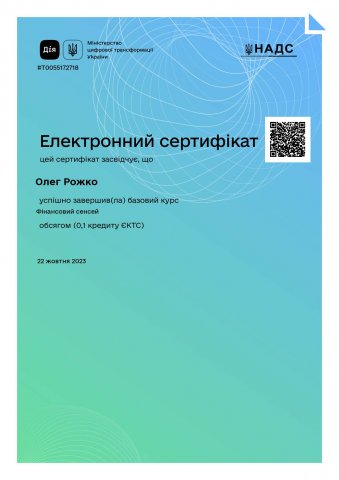 В рамках роботи Центру цифрових фінансів та е-бізнесу (кафедра фінансів ФЕУ) та пропагування новітніх освітніх можливостей неформальної освіти, в жовтні 2023 року студенти 5 курсу спеціальності 072 “Фінанси, банківська справа та страхування” (другого освітнього рівня “магістр”), на платформі ДіЯ. Цифрова Освіта. Міністерства цифрової трансформації України, вдало проходили базові курси Цифрові гроші; 10 запитань фінансовому коучу; Все про блокчейн, біткоїн та криптовалюту; Фінансовий сансей; Оплата комуналки онлайн й Дружні цифрові фінанси та отримали національного зразка Електронні сертифікати (обсягом 0,1 і 0,2 кредиту ЄКТС). Даний Сертифікат студенти-магістри можуть в подальшому додавати до свого Резюме при працевлаштуванні. Професор кафедри фінансів Краус Наталія Миколаївна надавала студентам консультативну підтримку з метою кращого проходження даних курсів. Результатом проходження курсів стало посилення фахових компетенцій в частині ознайомлення з особливостями кредитів і депозитів, знать про валютний рахунок і онлайн-банкінг, як використовувати кредитні кошти без сплати відсотків, як використовувати смартфон чи розумний годинник замість гаманця, як сплачувати комунальні послуги, поповнити рахунок чи переказати гроші на картку іншій особі, не виходячи з будинку, які основні правила використання картки, що допоможуть уникнути неприємних ситуацій.