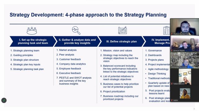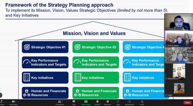 Мета заходу – ознайомити здобувачів з «родзинками» стратегічного планування в міжнародному бізнесі, а також поділитися практичним досвідом розробки стратегічного плану та бізнес-цілей компанії. Особливу увагу приділено складовим стратегії, що формують її базис: мета, візія, цінності та стратегічні цілі компанії; детально розглянуто 4-етапний підхід до розробки стратегії; проаналізовано 5 основних принципів стратегічного планування та особливості використання методів аналізу SWOP, PEST і 5 сил Портера. Після доповіді зустріч перейшла у більш жвавий режим «запитання-відповіді», здобувачі активно задавали питання, а гість обґрунтовано і змістовно відповідав на них!