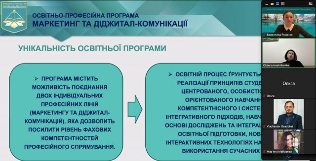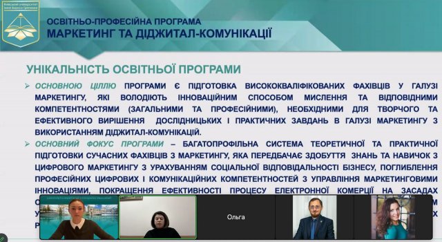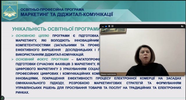 Проєкт представляла доцент кафедри міжнародної економіки Іващенко Оксана, яка підкреслила відповідність ОПП Стандарту вищої освіти, затвердженого наказом Міністерства освіти і науки України від 05.12.2018 р. № 1343. Доповідачка під час презентації проєкту ОПП зосередила увагу на унікальності, меті та особливості освітньо-професійної програми, формуванні додаткових спеціальних компетентностей та програмних результатів навчання ОПП, основних її складових, переліку обов’язкових та вибіркових освітніх компонент. Звернула увагу на те, що програма орієнтована на професійну та практичну підготовку фахівців у сфері маркетингу, знання та навички яких мають відповідати вимогам сучасності.