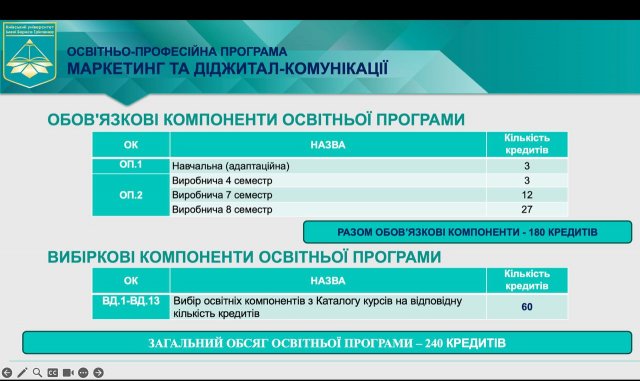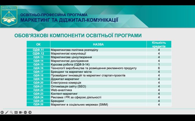 В ході обговорення проєкту ОПП, учасники зустрічі серед позитивних сторін відмітили: відповідність проєкту освітньо-професійної програми «Маркетинг та діджитал-комунікації» Стандарту вищої освіти за спеціальністю 075 Маркетинг для першого (бакалаврського) рівня вищої освіти; актуальність мети та особливості ОПП; правильність вибору і наповненість освітніми компонентами навчального плану, які забезпечують формування загальних і спеціальних компетентностей, програмних результатів та надаватимуть можливість здобувачам стати висококваліфікованими та конкурентоспроможними фахівцями на ринку праці; значну практичну підготовку здобувачів вищої освіти. Особливу увагу у ході зустрічі було приділено обговоренню переліку і обсягу освітніх компонентів та обґрунтуванню змістовного їх наповнення. Аналізуючи перелік обов’язкових освітніх компонент, запропоновано ввести обов’язкову освітню компоненту «Брендинг та маркетинг міст».
