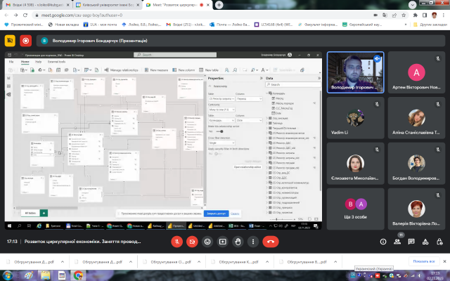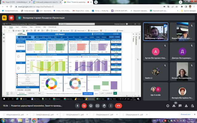 Володимир Ігорович розповів про інструменти впровадження бізнес-аналітики в компаніях. На початку двох практичних занять, які були проведені в один день, Володимир Ігорович надав короткий екскурс щодо застосування Power BI при проведені наукових досліджень, зокрема при проведенні економічних досліджень в циркулярній та цифровій економіці. Ознайомив здобувачів освіти із можливостями та обмеженнями при застосуванні інструменту Power BI. Показав на прикладах, як потрібно підготувати масив статистичних даних до використання у Power BI, як імпортувати підготовлені матриці даних до програми обробки, як проводити фільтрацію даних, обробляти помилки, як проводити візуалізацію даних, кластерний аналіз та прогнозування даних, формувати даш-борд.