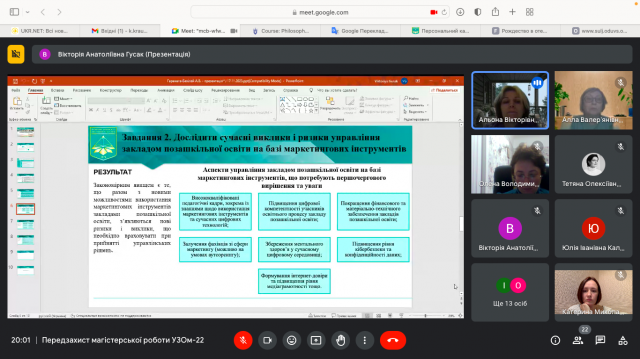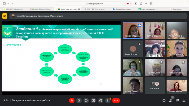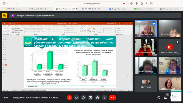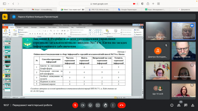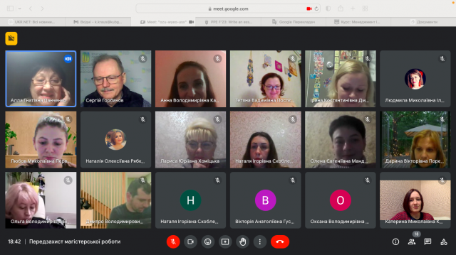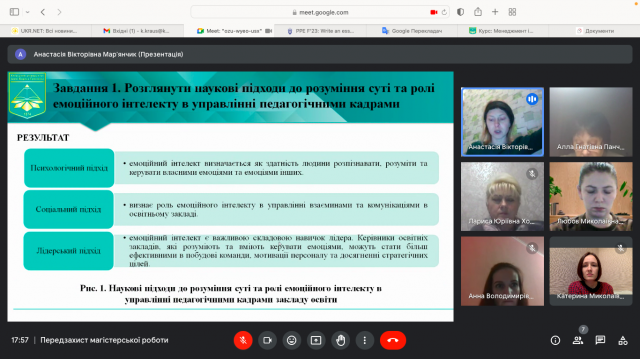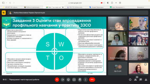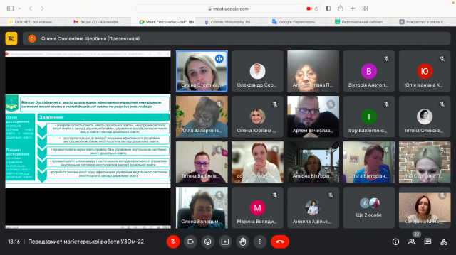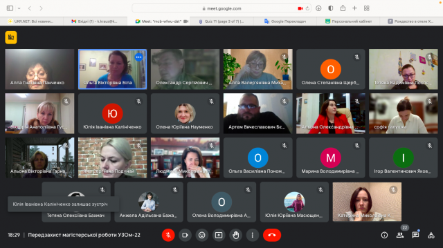 16-17 листопада 2023 року на кафедрі управління відбувся передзахист магістерських робіт студентів гр. УЗОм-1-22-1.4з спеціальності 073.00.03 Управління закладом освіти (за рівнями). У заході взяли участь 29 студентів та науково-педагогічні працівники кафедри управління, зокрема к. наук з держ. управл., доцентка кафедри управління Панченко А.Г.; д.е.н., професорка, професорка кафедри управління Ільїч Л.М.; к.е.н., доцент, доцент кафедри управління Яковенко І.В.; к.е.н., доцентка, доцентка кафедри управління Акіліна О.В.; к. педаг. наук, доцентка кафедри управління Михацька А.В.; к.е.н., доцентка, доцентка кафедри управління Краус К.М.; д. наук з держ. управл., доцентка, професорка кафедри управління Поспєлова Т.В.; д. псих. наук, професорка Міляєва В.Р. та освітній омбусмен Горбачов С.І..