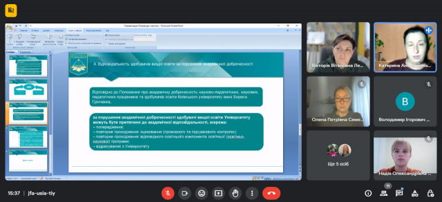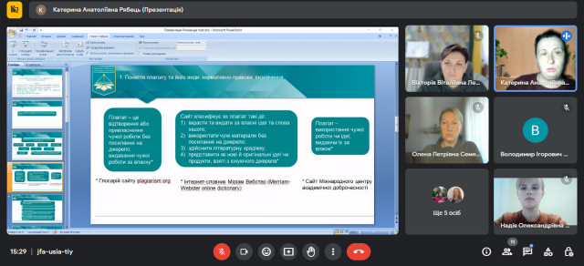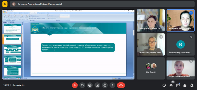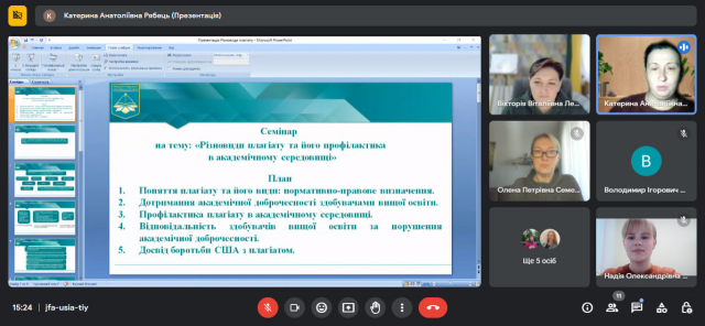 21.11.2023 року д.н.держ.упр., доцентом, заступником декана ФЕУ з наукової роботи Рябець Катериною Анатоліївною був проведений онлайн-семінар «Різновиди плагіату та його профілактика в академічному середовищі» для членів Наукового товариства студентів, аспірантів і молодих вчених Факультету економіки та управління. Метою семінару було визначено надання знань членам Наукового товариства щодо: сутнісних особливостей та видів плагіату, які визначені на законодавчому рівні та у науковій сфері; вимог, які ставляться до здобувачів вищої освіти в контексті дотримання академічної доброчесності; заходів профілактики академічного плагіату в Університеті; видів академічних стягнень.