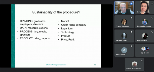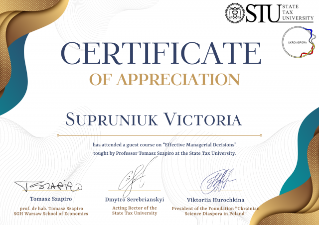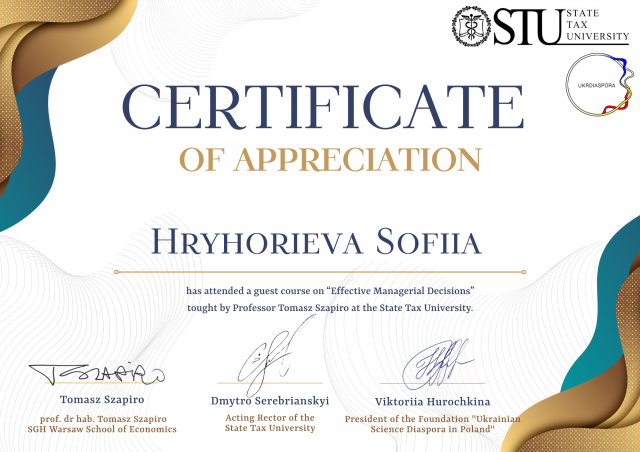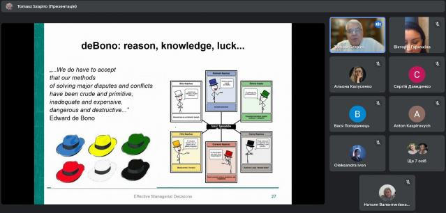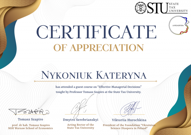 З 10 жовтня по 14 листопада 2023 року викладачі кафедри міжнародної економіки (професор Ушенко Наталя, викладач Никонюк Катерина) та здобувачі Університету Грінченка освітніх програм бакалаврату «Економіка міста. Урбаністика», «Реклама та зв’язки з громадськістю», магістратури «Міжнародна економіка» прослухали міжнародний курс лекцій "Теорія прийняття управлінських рішень" від лектора Томаша Шапіро (Польща).